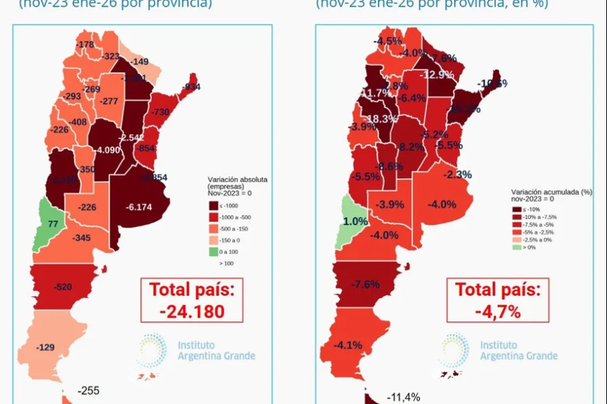 La caída de empresas se dio en 23 de 24 jurisdicciones, con la Provincia de Buenos Aires como la más afectada, con 6.174 firmas menos. Le siguieron Córdoba (-4.090) y Santa Fe (-2.542).